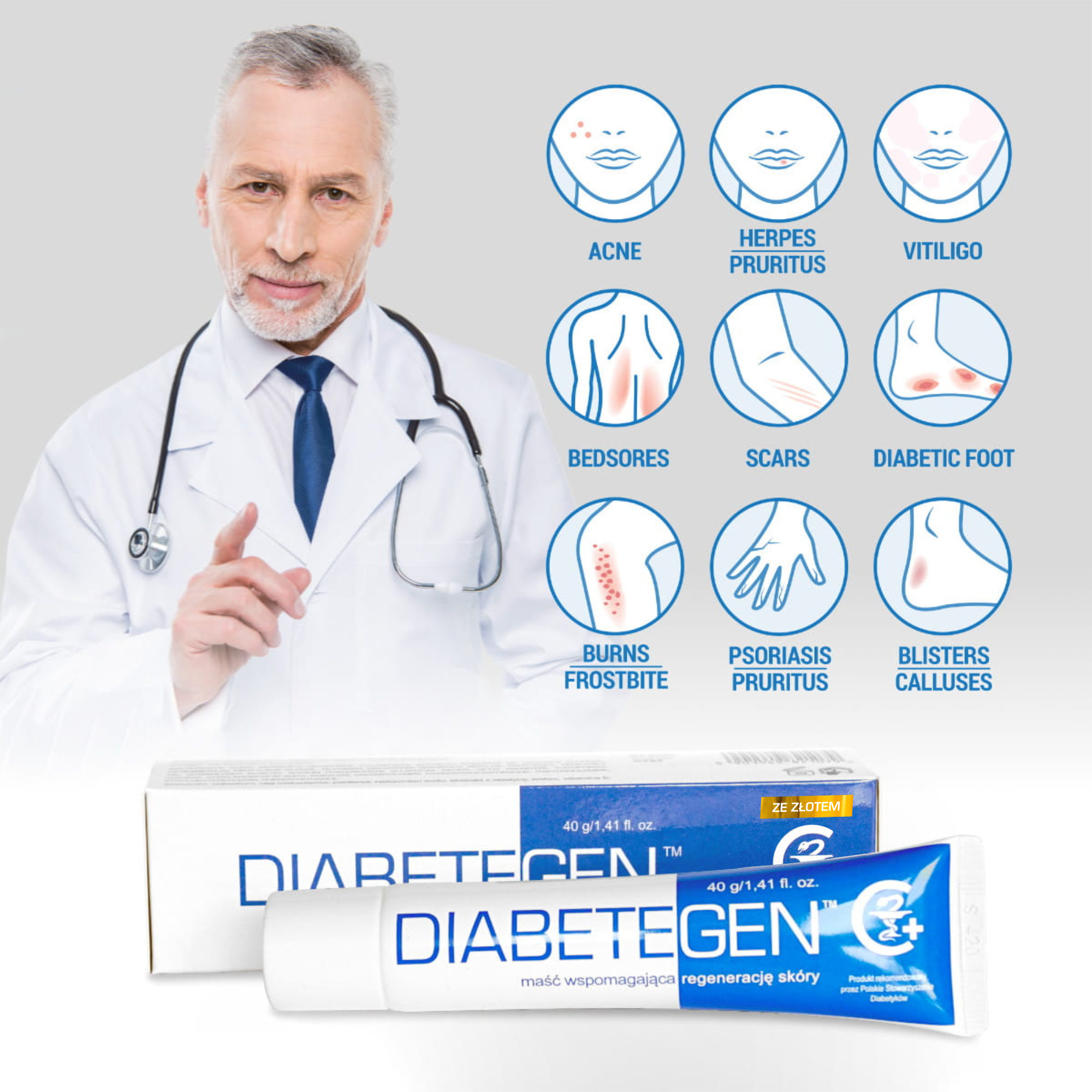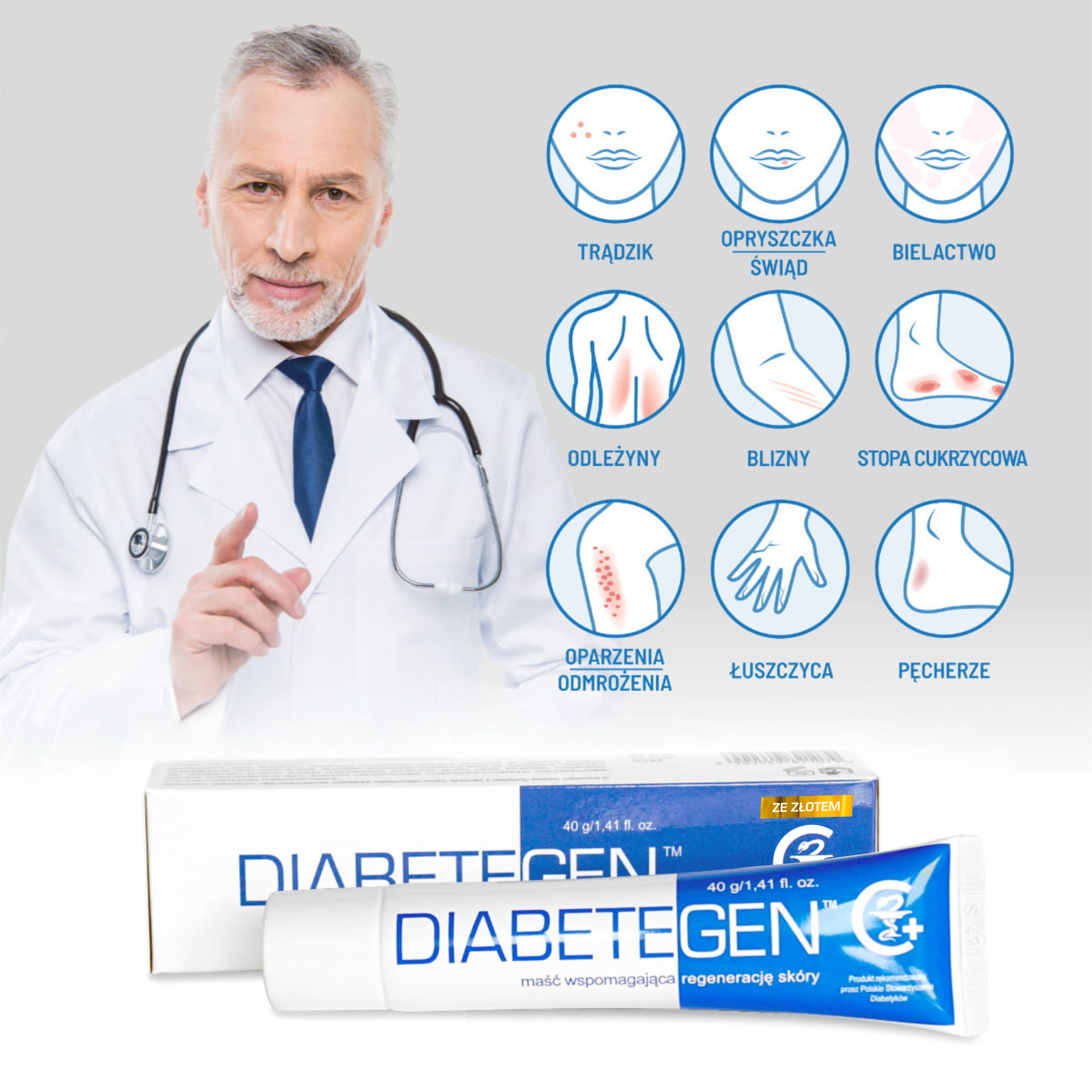 Scientists and doctors, who recognized Diabetegen cream as the best cosmetic for slow-healing wounds for diabetics and patients in palliative care: Barbara Mirkiewicz-Sieradzka, MD, Ph.D. Jacek Łuczak, MD, Ph.D. Danuta Perek, MD, Ph.D. Danuta Sońta-Jakimczyk, MD, Ph.D. Irena Ponikowska, MD, Ph.D. Jacek Sieradzki, MD, Ph.D. Czesław Wójcikowski, MD, Ph.D. Roman Cichoń, PhD Marzena Samardakiewicz, PhD of Medical Sciences Zbigniew Bohdan, PhD of Medical Sciences Wojciech Madziara, Doctor of Medicine Elżbieta Szymańska, Doctor of MedicineJacek Chojnowski, Doctor of Medicine Wiesław Jundził, Doctor of Medicine Jerzy Jambor, Dr. of Pharmaceutical Sciences Andrzej Bauman, MSc - The President of PSD Beata Stepanow, MSc