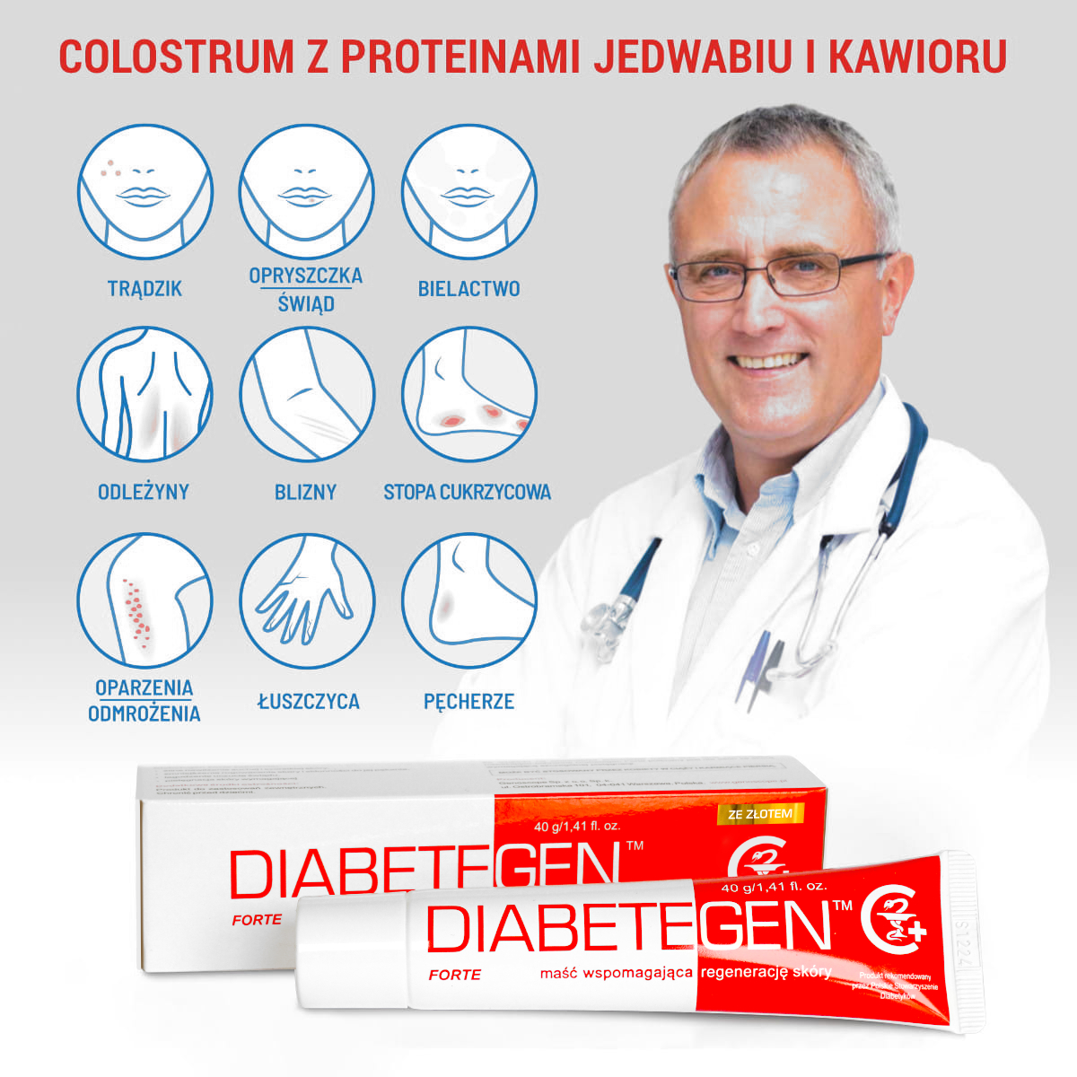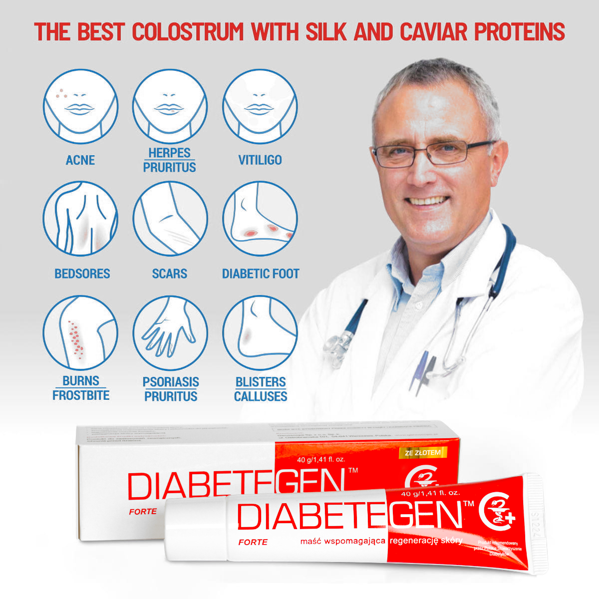 Diabetegen Forte Aids in tissue regeneration Use: Diabetic foot, ulceration, acne, bed sores, very strong dry and rough skin moisture, reduction of skin keratosis and tendency to cracking, relieve the feeling of itching.